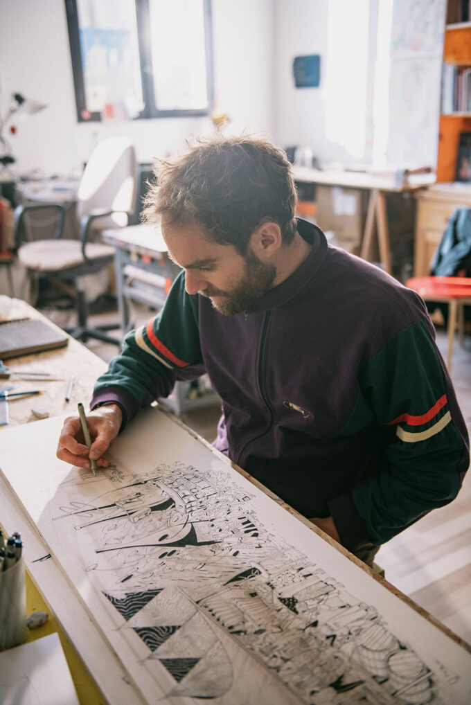 Antoine Martinet dit Mioshe dessine et peint sur le mur et sur la toile la relation entre l’humain, l’urbain, la nature et l’espace dans lesquels ses éléments s’inscrivent. Son univers mêle figures hybrides et chimériques, la faune et la flore, le masculin et le féminin, le cosmique et l’historique.